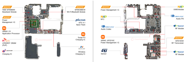 從供應(yīng)商構(gòu)成來看,聯(lián)發(fā)科作為最大的芯片供應(yīng)商,在通信、射頻等核心領(lǐng)域提供了多達4個關(guān)鍵組件,體現(xiàn)了其在移動平臺解決方案上的綜合實力。
