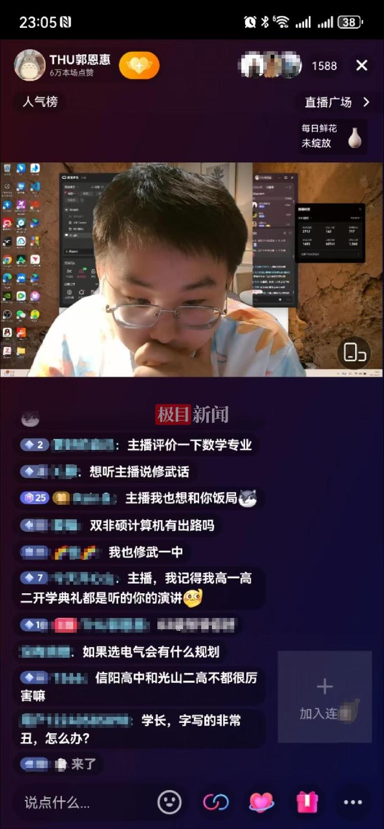 6月27日晚,在北大上了一節課退學后又考上清華的郭恩惠(極目新聞此前報道)開啟了首場直播。他在直播中跟網友交流志愿填報、學校專業選擇等方面的問題。對于有網友推測他即將帶貨的說法,29日,郭恩惠回應極目新聞記者稱,他只是暑假業余時間播著玩,沒想過帶貨。