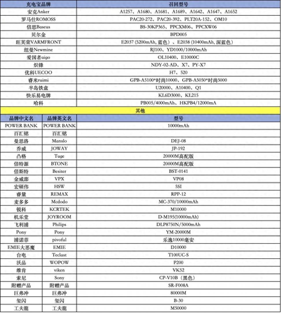 充電寶召回型號(hào)