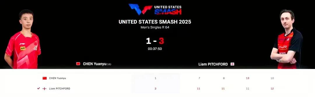 隨后是中國隊19歲小將陳垣宇1:3不敵皮切福德,止步首輪,也是中國乒乓球隊在此次比賽中的第一個遭遇一輪游的選手。