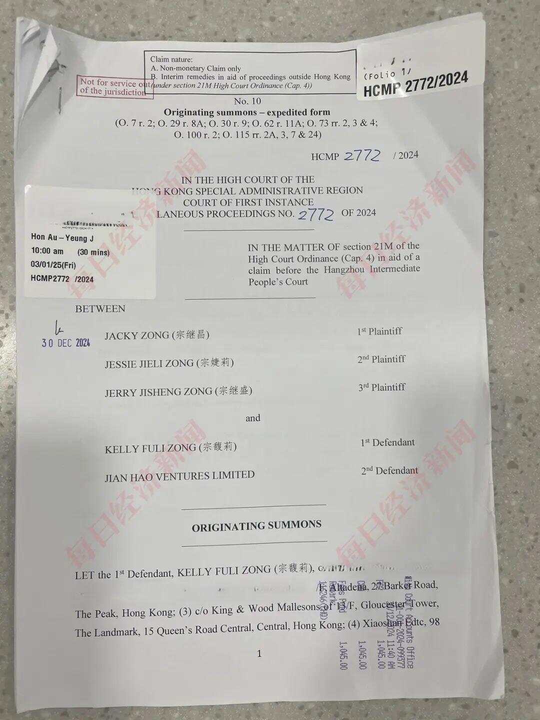 7月15日,記者從從香港高等法院查詢 獲悉了一份以上述三名“子女”為原告,宗馥莉、Jian Hao Ventures Limited(下文稱為建昊企業(yè)有限公司)為被告人的訴狀。