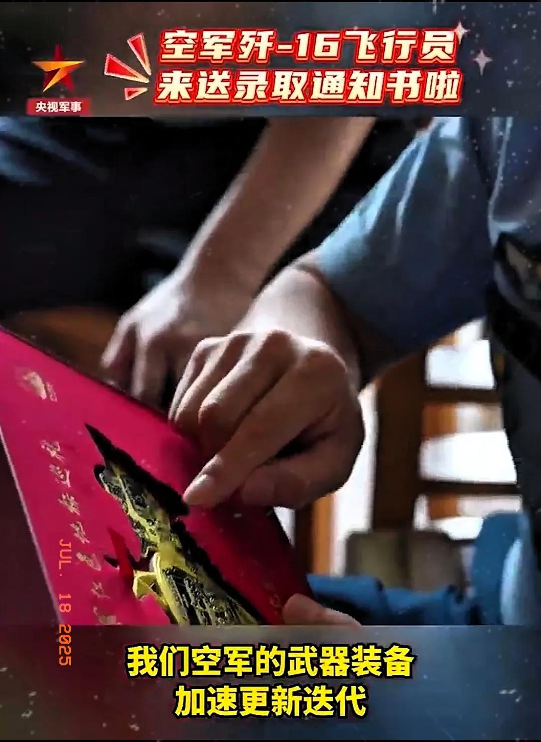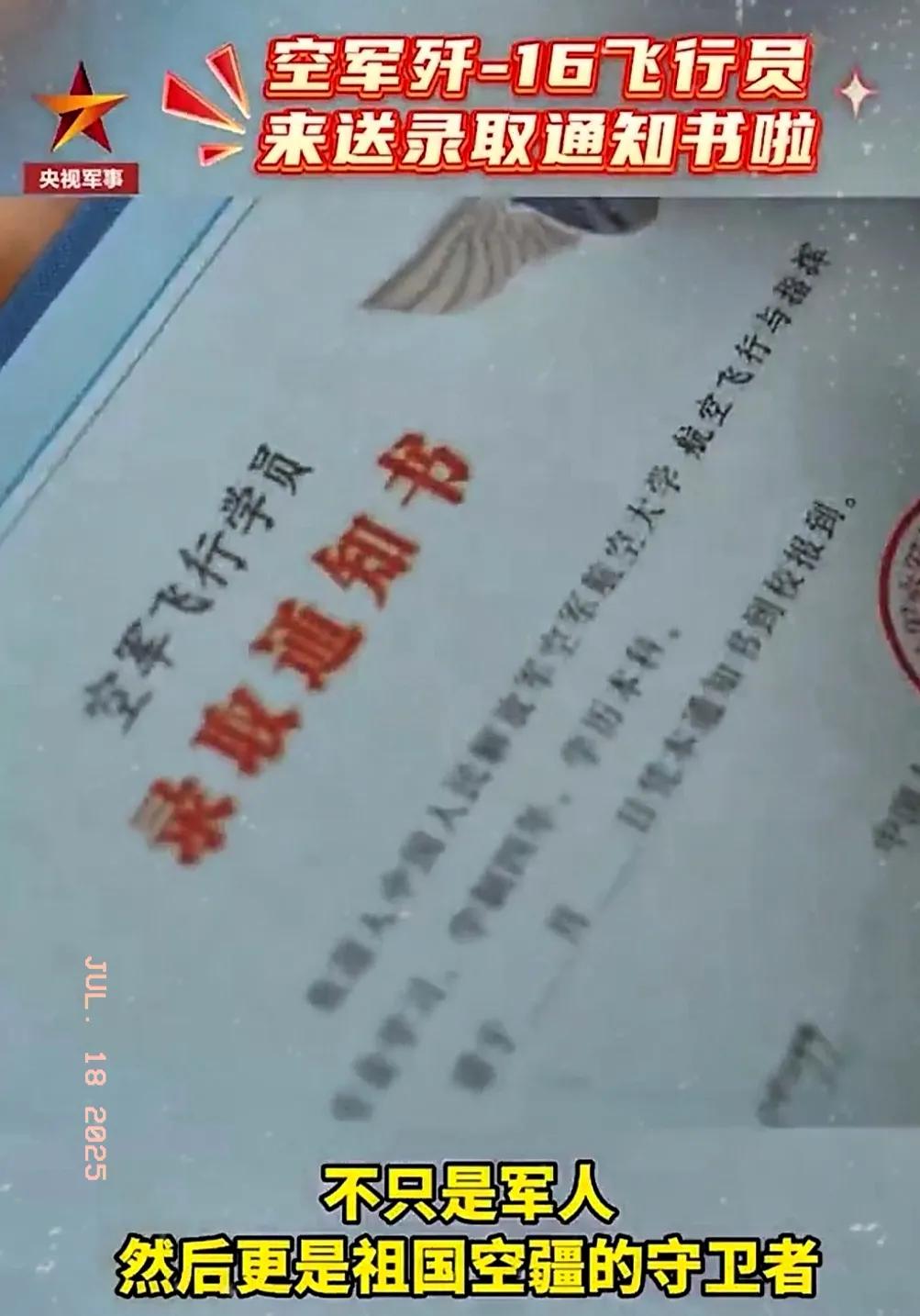 7月14日,殲-16戰機飛行員、中國軍校形象代言人王文毅親自將空軍航空大學錄取通知書送到他手中。