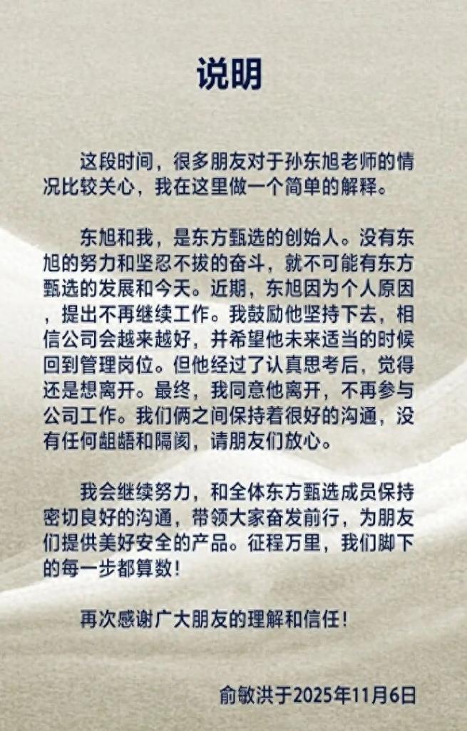 主角就是俞敏洪和孫東旭唄,孫東旭因為個人原因離職,俞敏洪也發文了,說溝通良好,沒啥矛盾,挺官方的,大家都覺得這事不簡單。