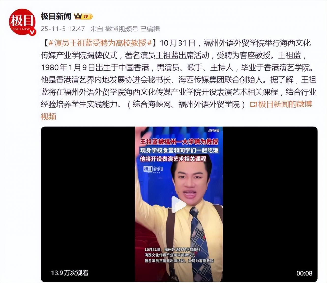 11月5日報道,演員王祖藍獲聘福州外語外貿學院客座教授的消息,讓不少網友直呼“跨界玩得溜”。不過,比起頭銜本身,更引人關注的是這位新晉教授“尚未開課、檔期協調”的特殊狀態,瞬間在網絡上點燃了關于“明星教授是務實還是噱頭”的熱議。