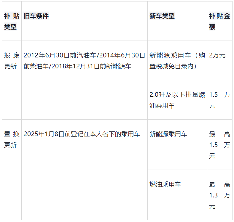 本輪補貼實現"雙向擴容",首次將國四排放標準燃油乘用車納入報廢更新支持范圍。具體來看,個人消費者報廢符合條件舊車并購買新車,可享受以下補貼: