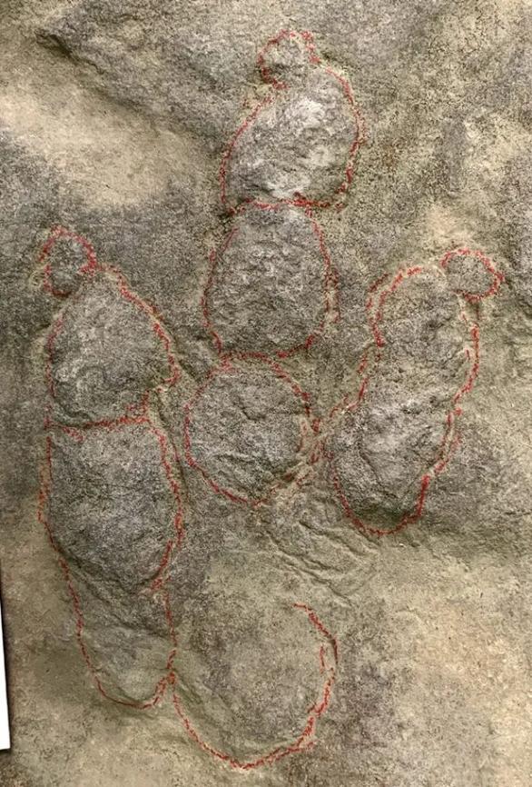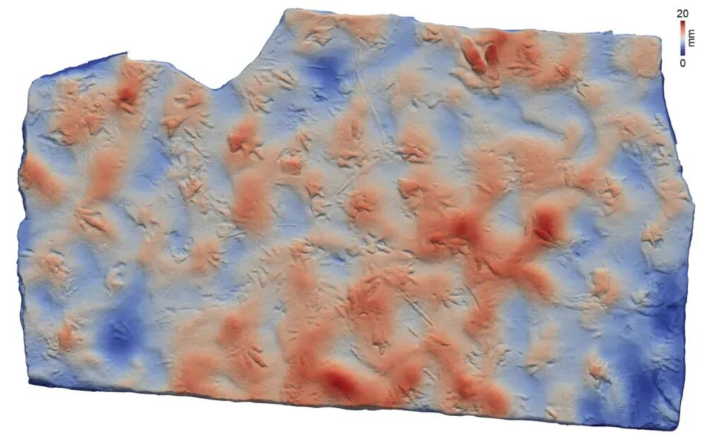 值得注意的是,研究人員還對化石上的多道細(xì)長痕跡進行毫米級精度的三維成像。分析發(fā)現(xiàn),與足跡相伴的還有數(shù)條清晰的“尾跡”。這些尾跡長度在20厘米至40厘米之間,寬約2厘米至3厘米,深度較淺,確認(rèn)為恐龍尾部與地面接觸的直接遺跡。