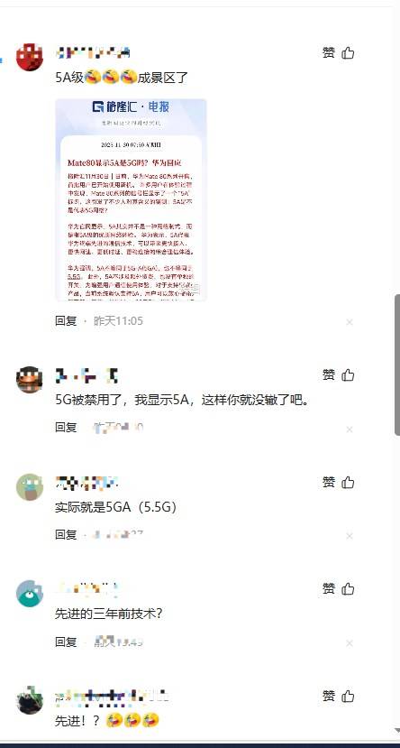另一部分人則進(jìn)行了冷嘲熱諷,有人調(diào)侃:5G被禁用,我顯示5A,這樣你就沒轍了吧。有人質(zhì)疑:先進(jìn)的三年前技術(shù)?還有人直接嘲諷:5A級都成景區(qū)了。