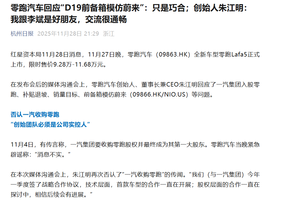 為了佐證這一說法,零跑汽車創始人朱江明補充道,美國也有兩家車企設計了前備箱,暗示這是行業共同趨勢而非單一模仿行為。