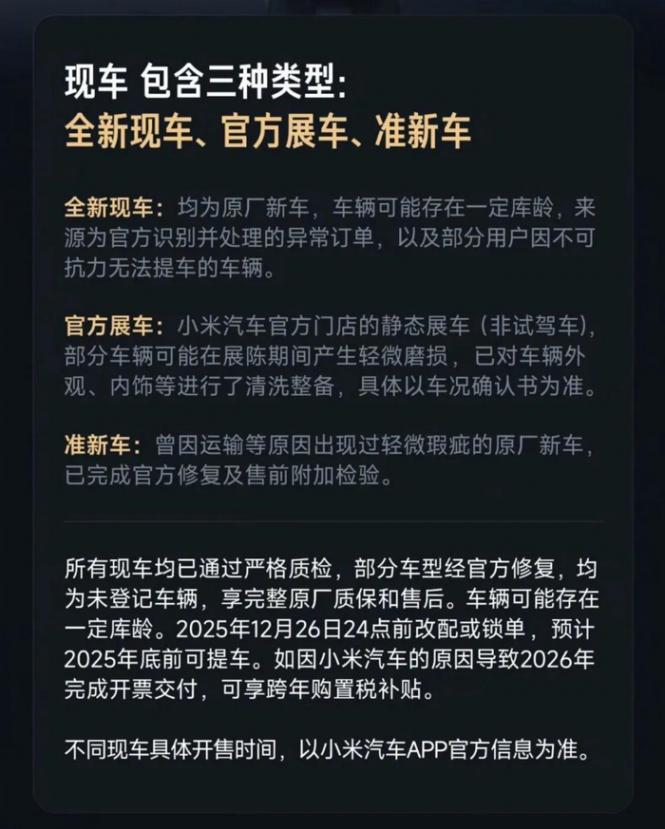 小米現車包含了三種類型,包括:全新現車、官方展車、準新車。
