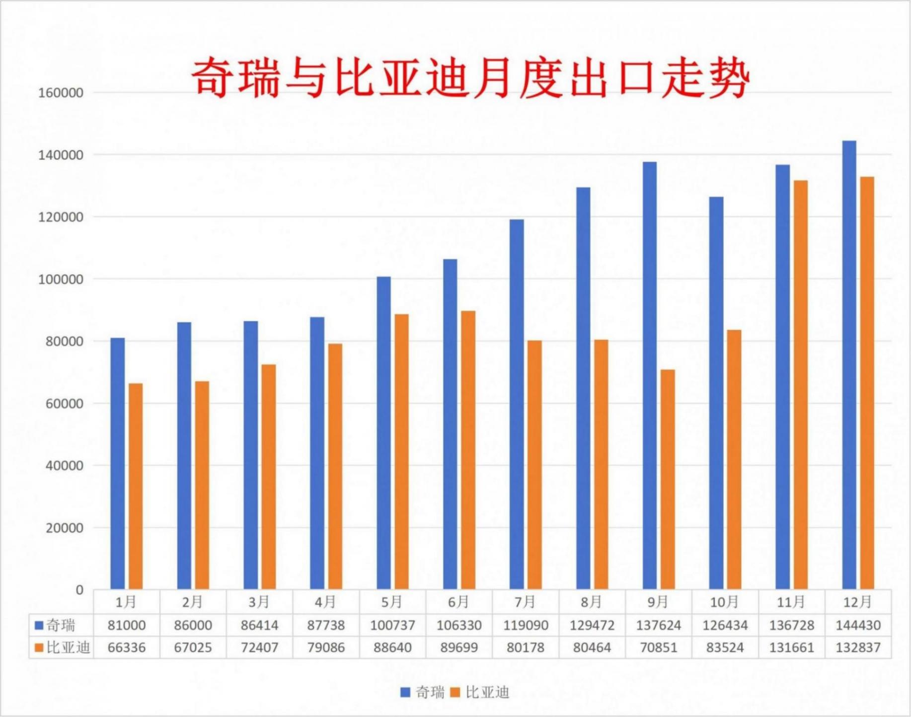尤為可喜的是,奇瑞在總銷量創新高的同時,年度出口量高達134萬輛,占比超46.8%,相當于每賣出2輛車就有1輛出口。其中,12月單月出口突破14萬輛,創中國車企出口新紀錄。