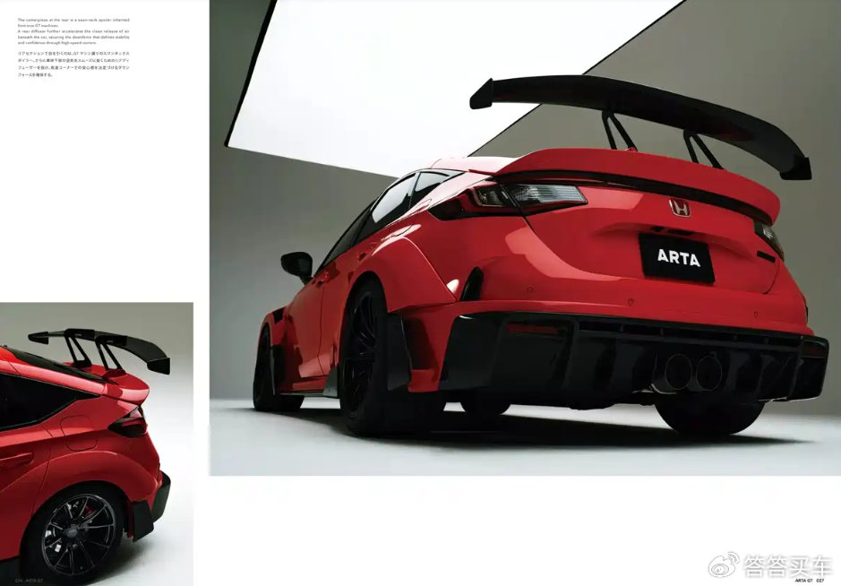 外觀方面,從發布的官圖來看,新車外觀應用大量空氣動力學套件,前包圍進行了加寬,與兩側的寬體輪眉融為一體,前包圍底部擁有大尺寸通風口,配合機艙蓋上的三段式通風口,散熱功能有很大提升。新車在底部環繞了前鏟、側裙等部件,為前后輪帶來更強的下壓力。新車在輪眉前后均設置了通風口,配備了一款定制輪胎,并采用黑色的AP Racing剎車卡鉗。新車尾部擁有大尺寸擾流板與擴散器,繼續采用中置雙出式排氣,排氣上印有“ARTA”標識。